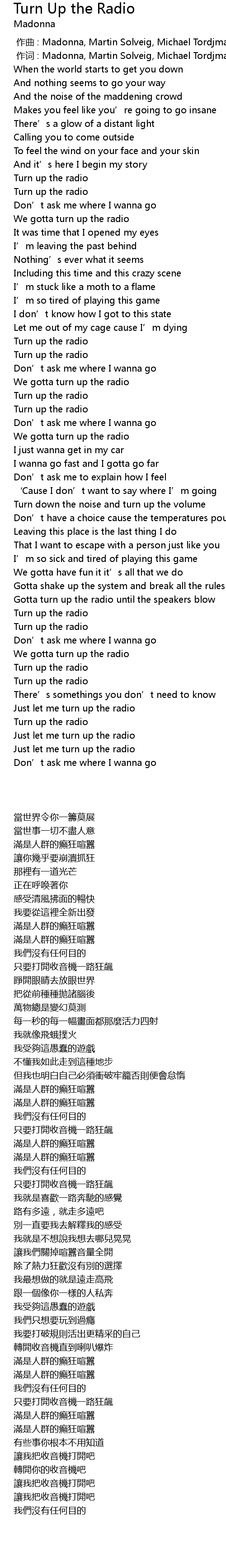 | [00:01.00] | 作词 : Madonna, Martin Solveig, Michael Tordjman, Jade Williams |