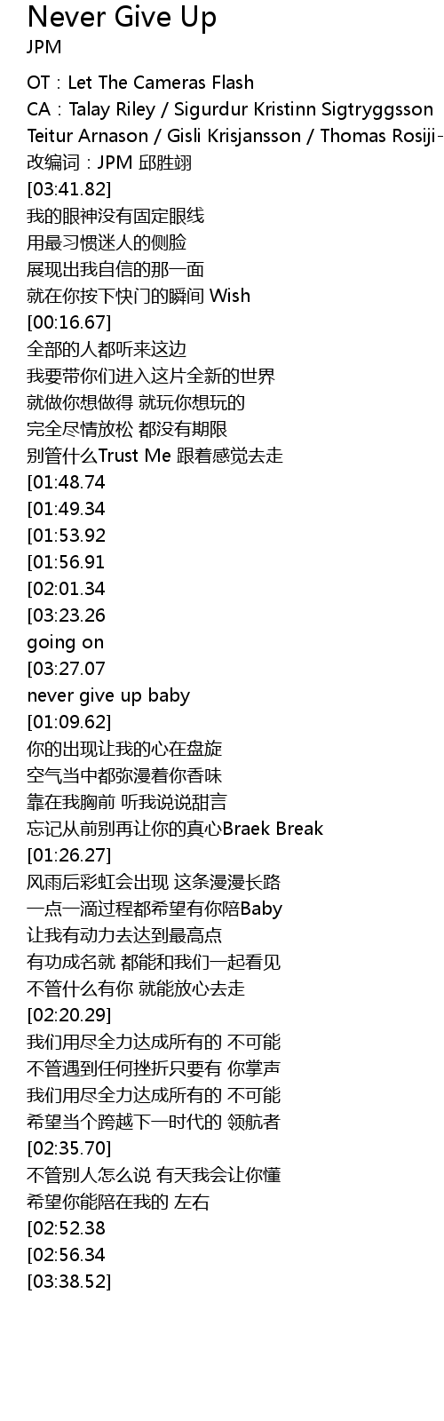 | [03:34.85][03:27.07][02:17.50][02:09.75][01:07.80][01:00.09] | Keep going on we never give up baby |