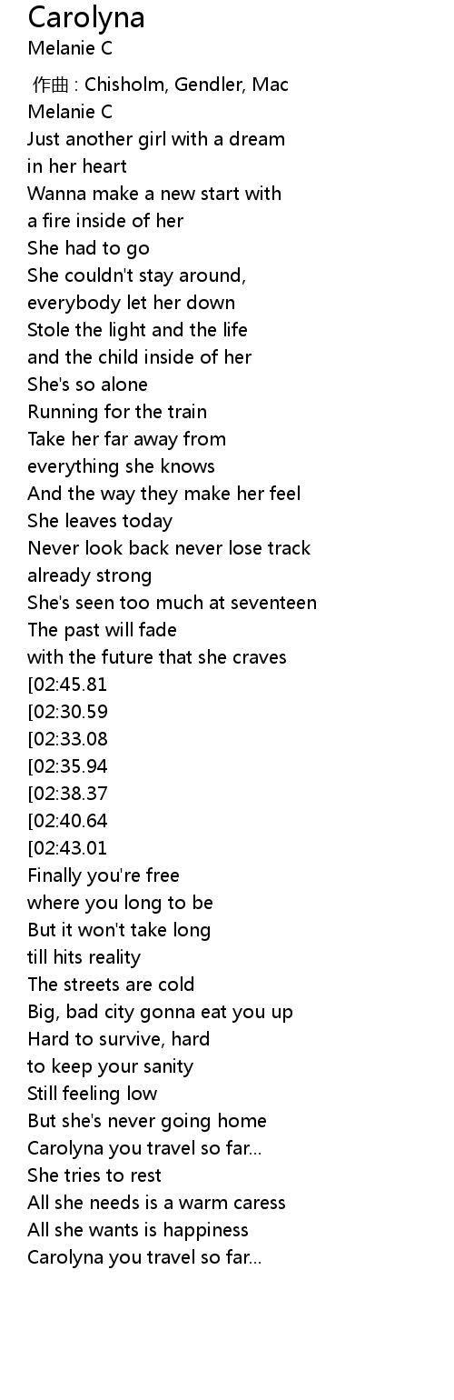 | [03:06.24][02:45.81][00:53.93] | Carolyna you travel so far |
