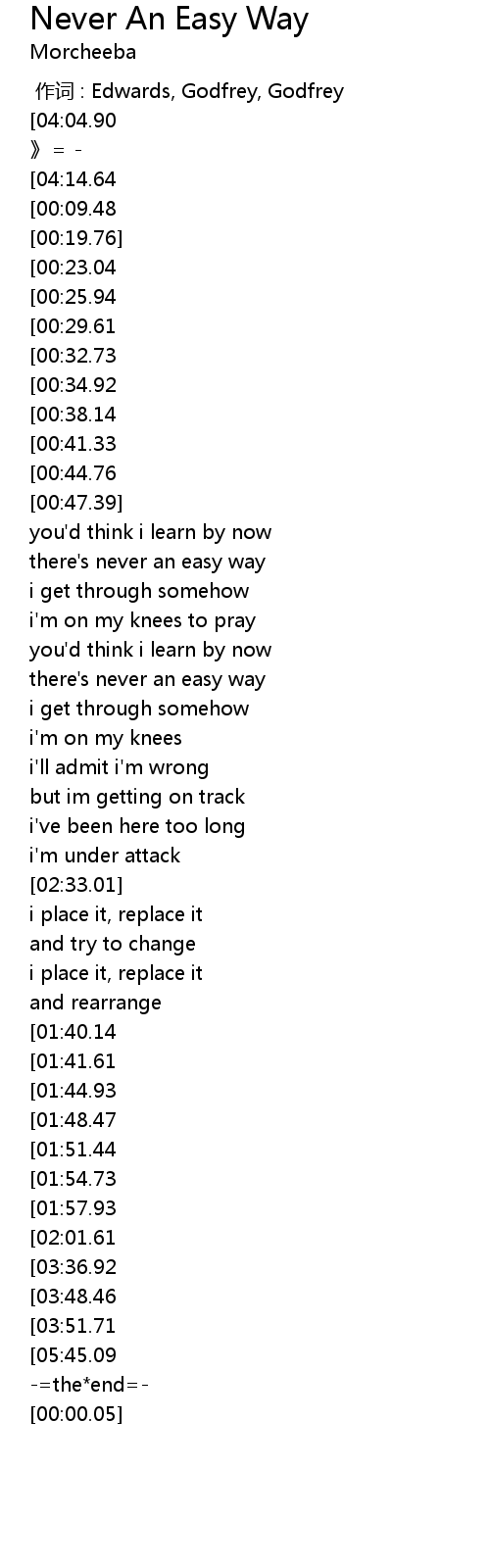 | [05:48.39][04:04.90][02:28.37][00:00.00] | -= morcheeba 《 never an easy way 》=- |