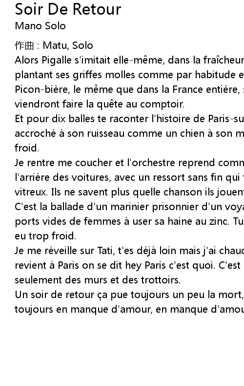 | Un soir de retour a pue toujours un peu la mort, un soir de retour on est toujours en manque d' amour, en manque d' amour |