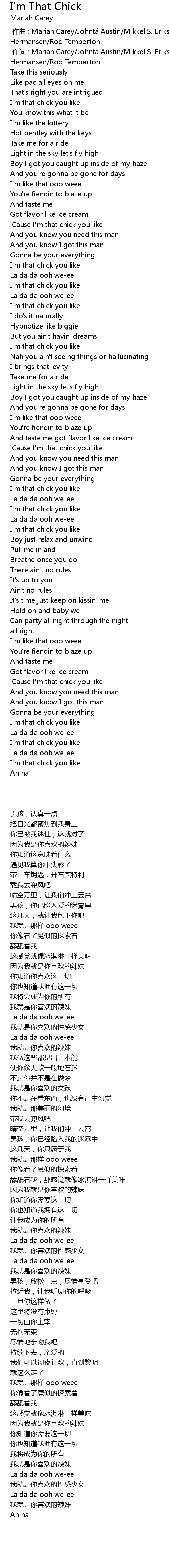 | [00:01.00] | 作词 : Mariah Carey/Johntá Austin/Mikkel S. Eriksen/Tor E. Hermansen/Rod Temperton |