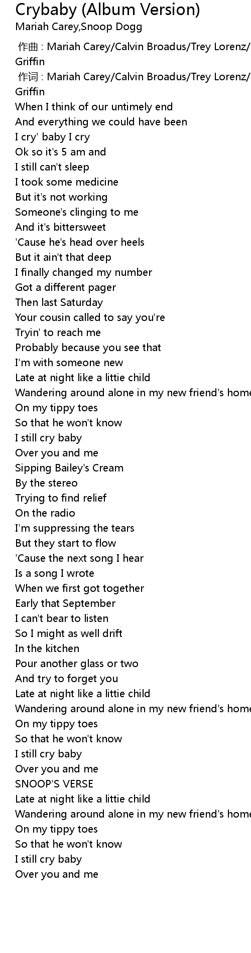 | [00:01.00] | 作词 : Mariah Carey/Calvin Broadus/Trey Lorenz/Teddy Riley/Gene Griffin |