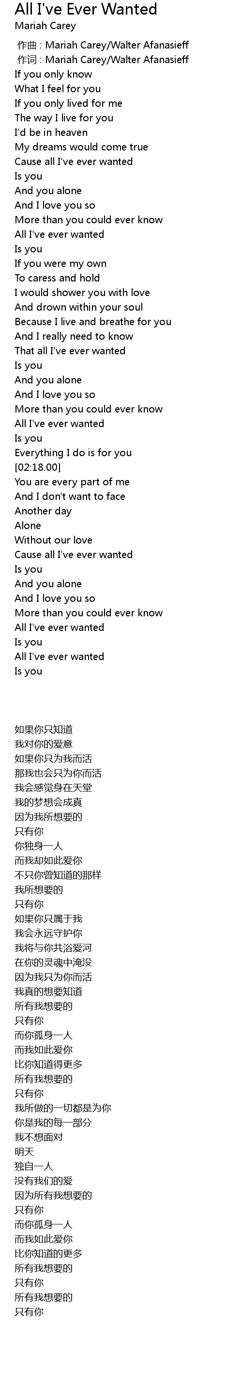 | [00:01.00] | 作词 : Mariah Carey/Walter Afanasieff |
