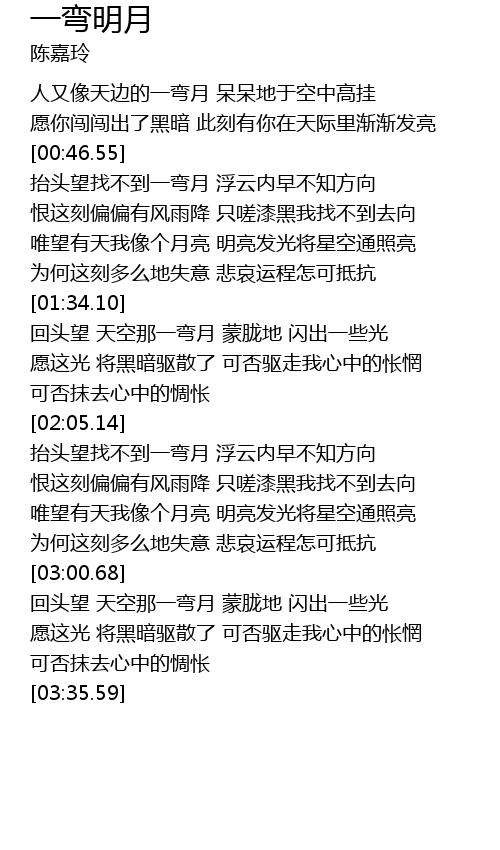 | [01:34.82] | 回头望 天空那一弯月 蒙胧地 闪出一些光 |