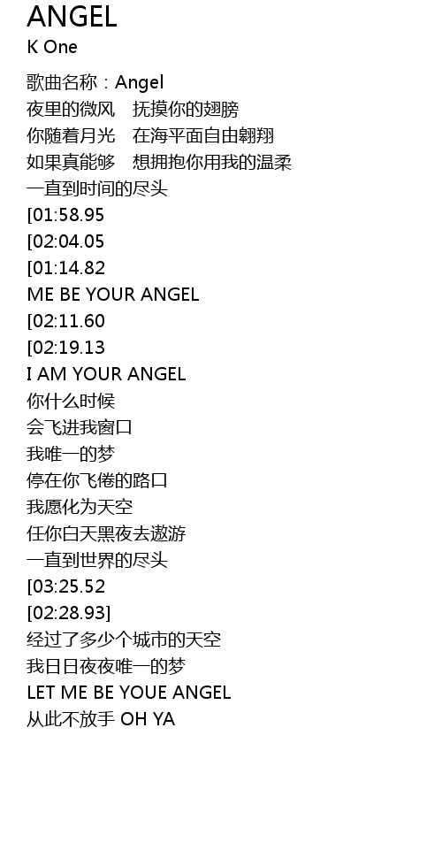 | [02:25.85][03:25.52][03:55.56][04:26.21] | I AM YUOR ANGEL |