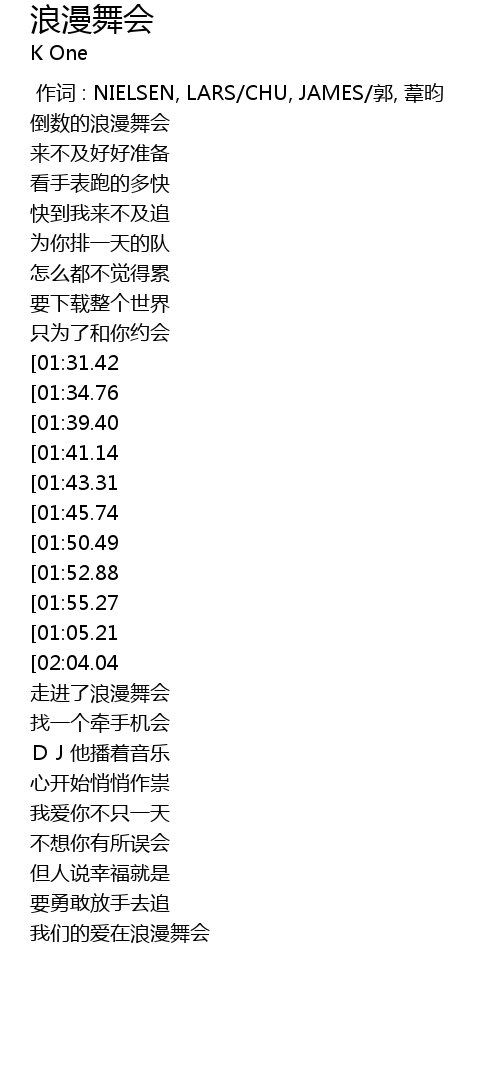| [00:57.95][01:55.27][02:33.56][02:52.60] | 我们的爱在浪漫的舞会 |