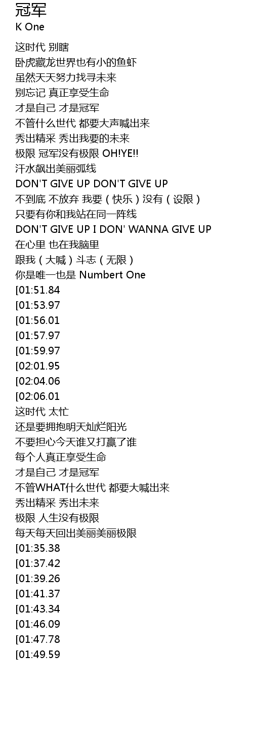 | [02:53.15][02:04.06][01:06.51] | CHAMPION wo men jiu shi guan jun |