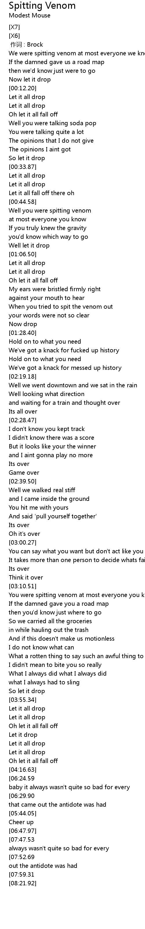 | [08:13.00][07:52.69][07:42.31][07:32.09][07:21.77][07:11.30] | Venom then that came out the antidote was had |