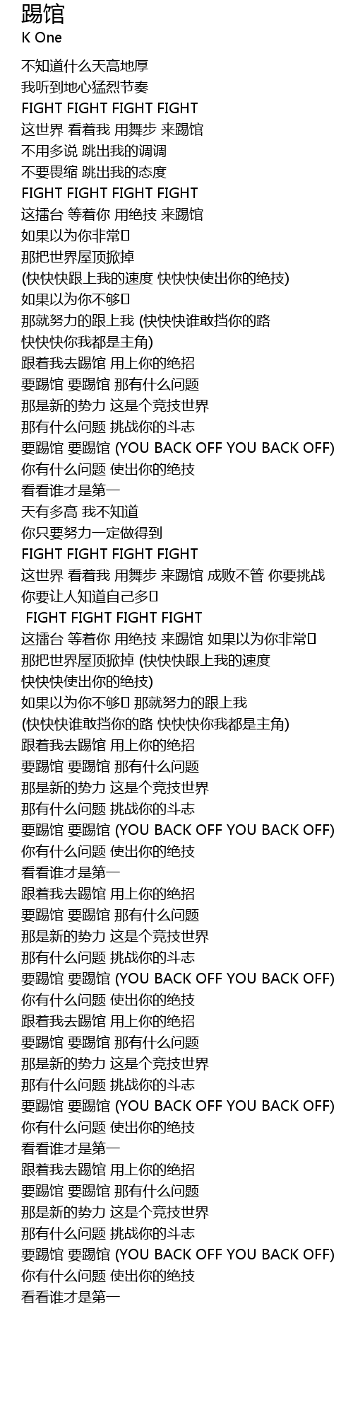 | [01:23.43] | 要踢馆 要踢馆 (YOU BACK OFF YOU BACK OFF) |