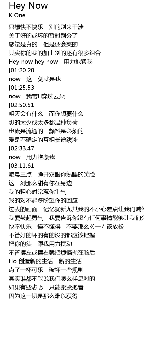 | [01:13.75][02:33.47][02:54.39][03:15.84] | wo zhi xiang dui ni shuo hey now hey now yong li bao jin wo |
