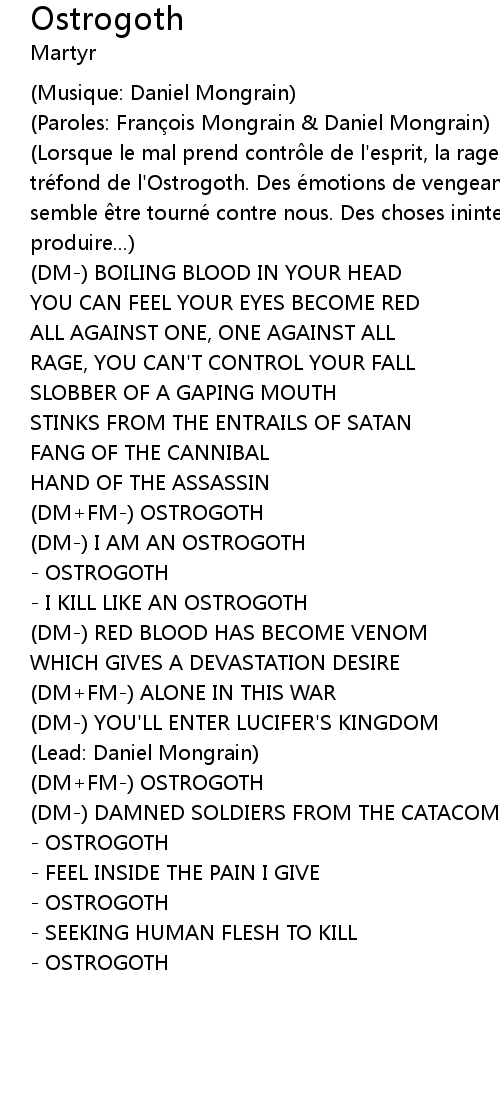 | (Lorsque le mal prend contrôle de l'esprit, la rage incontrolable fulmine au tréfond de l'Ostrogoth. Des émotions de vengeance peuvent surgir lorsque tout semble être tourné contre nous. Des choses inintentionnelles pourraient se produire...) | |