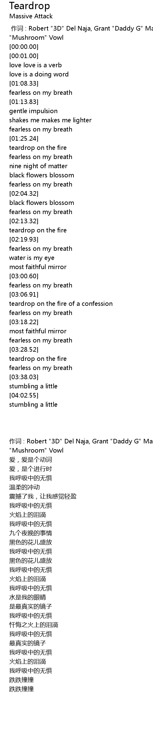 | [00:00.00] | zuò cí : Robert " 3D" Del Naja, Grant " Daddy G" Marshall, Andrew " Mushroom" Vowl |