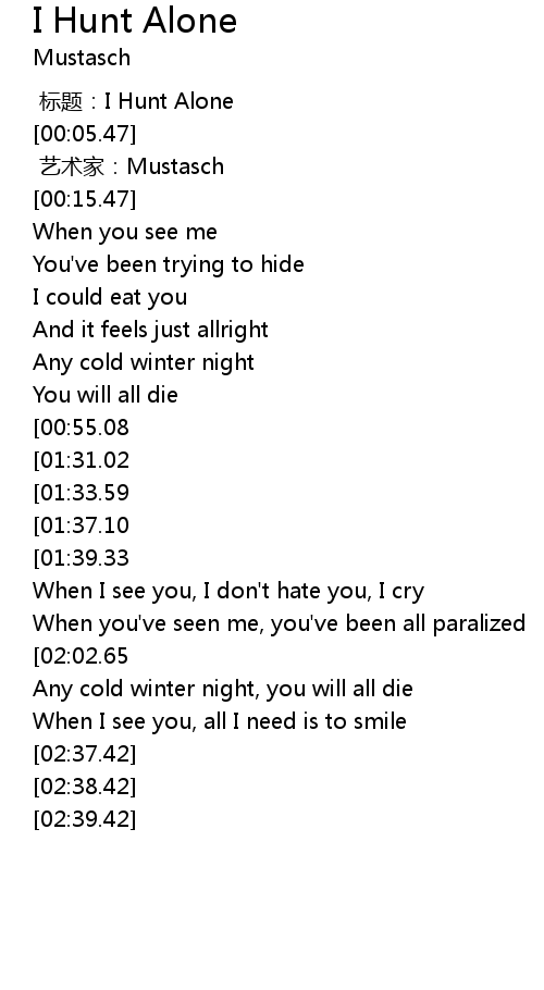 | [00:52.85][01:39.33][02:25.65][02:36.42] | I hunt alone |