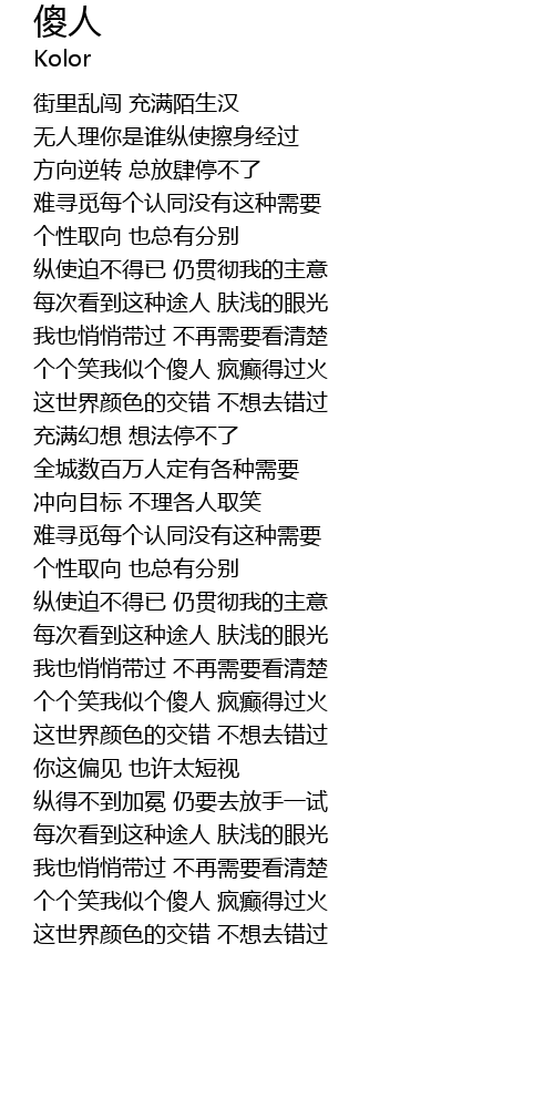 | [00:59.17] | gè gè xiào wǒ shì gè shǎ rén fēng diān dé guò huǒ |