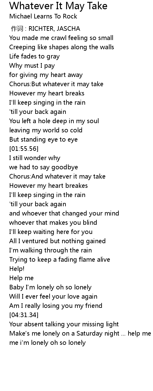 | [02:15.94] | Chorus: And whatever it may take |