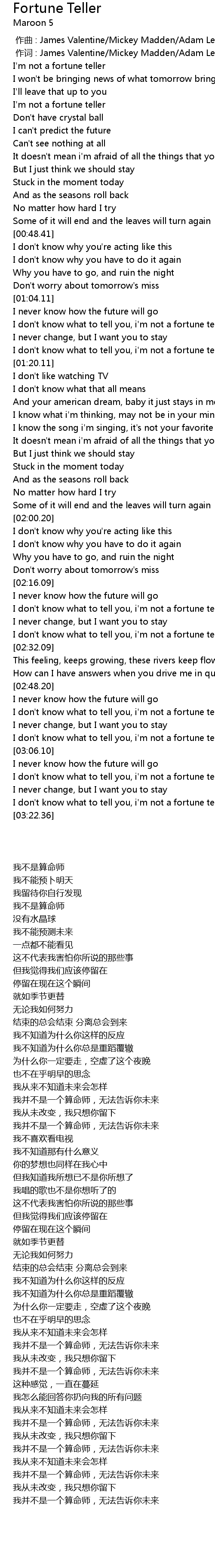 | [00:01.00] | zuò cí : James Valentine Mickey Madden Adam Levine |
