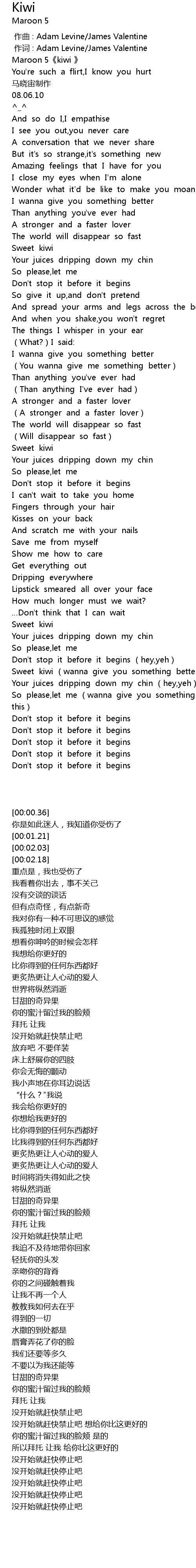 | [00:00.36] | Maroon 5《kiwi 》 |