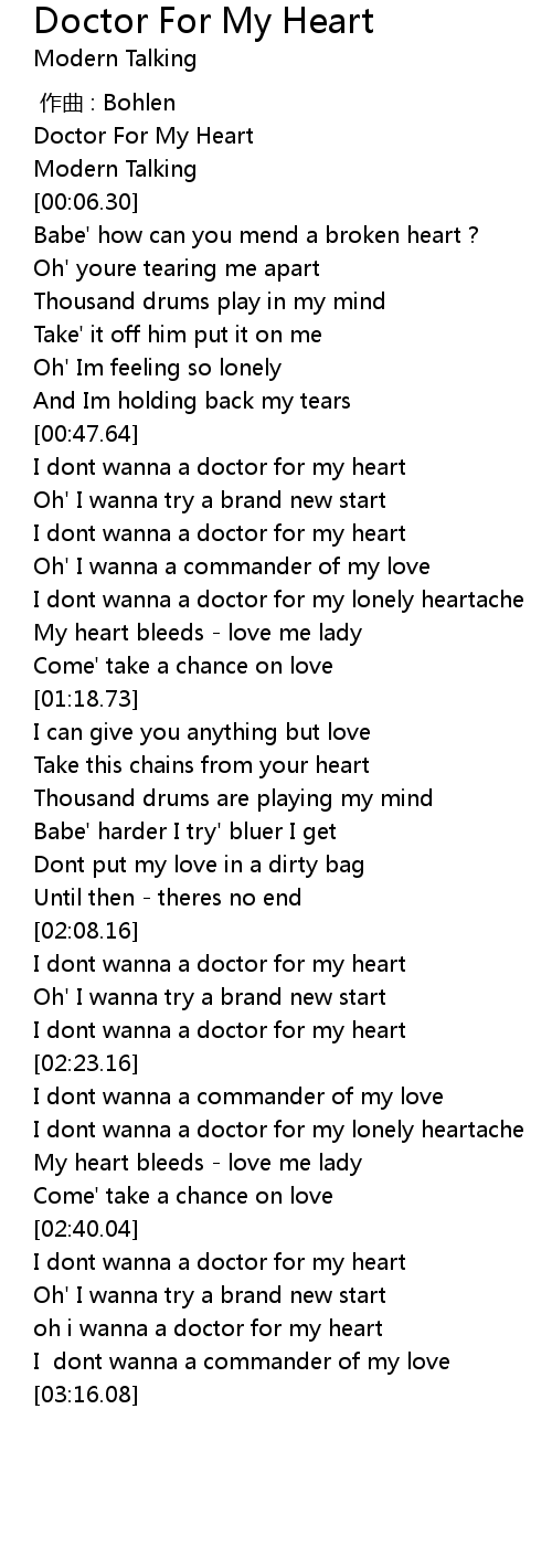 | [03:08.64] | oh i wanna a doctor for my heart |