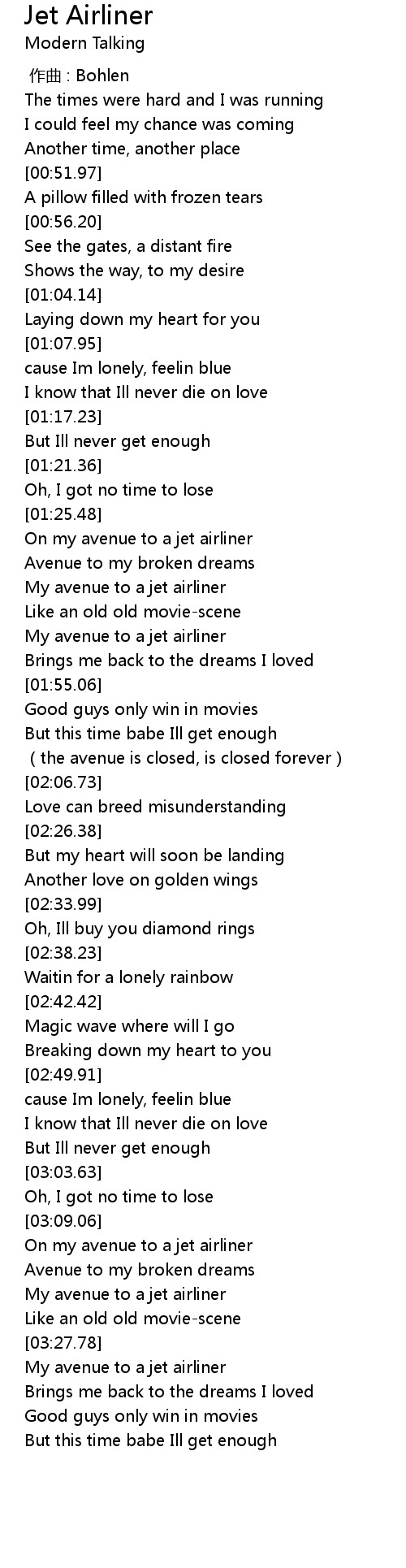 | [03:11.49] | On my avenue to a jet airliner |