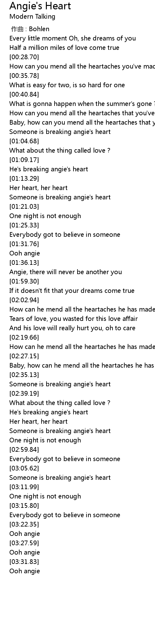 | [03:08.49] | Someone is breaking angie' s heart |