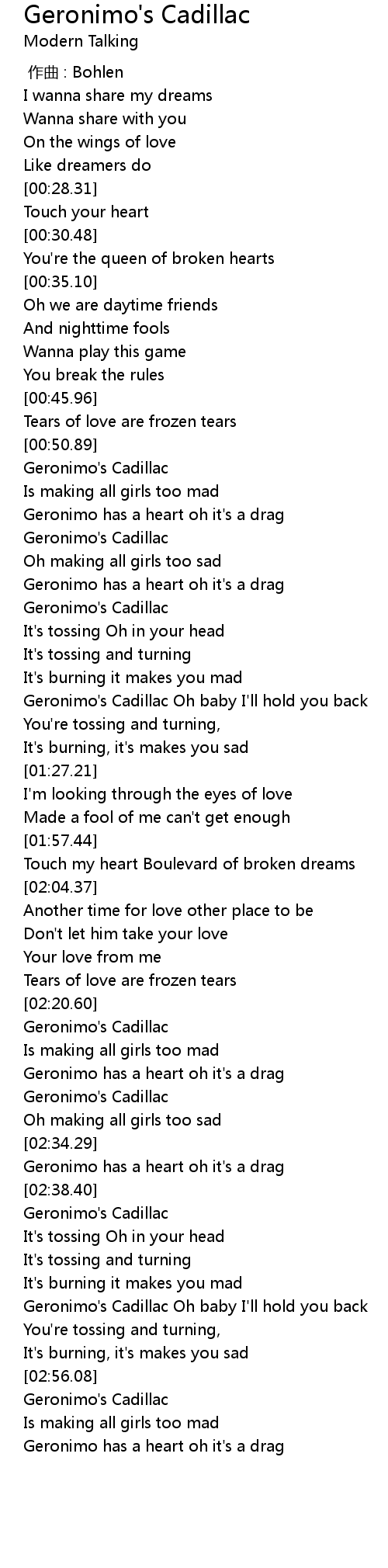| [02:21.99] | Geronimo' s Cadillac |