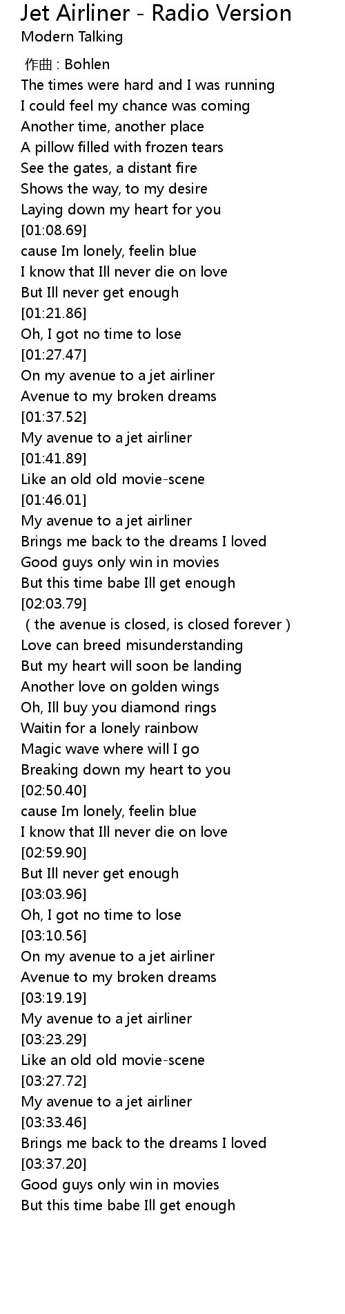 | [03:11.56] | On my avenue to a jet airliner |