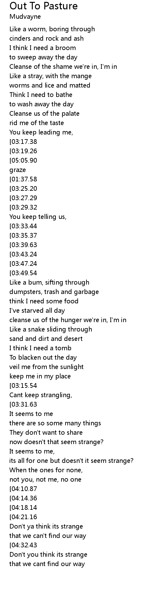 | [05:22.02][05:05.90][03:37.40][03:21.11][01:51.47][01:35.39] | out to pasture to graze |
