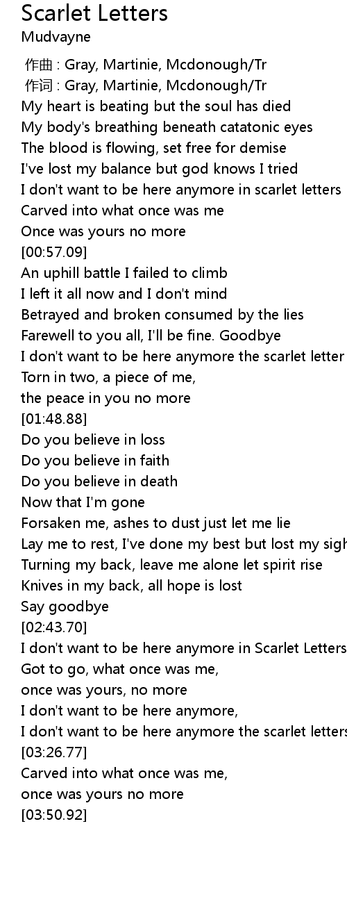 | [03:16.57] | I don't want to be here anymore the scarlet letters |