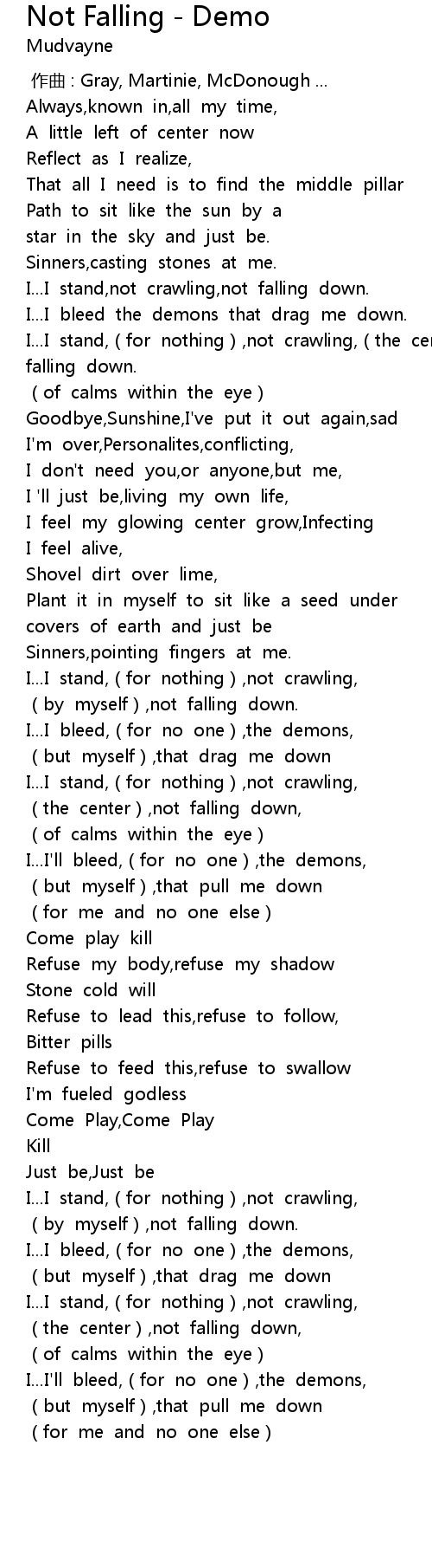 | [00:58.755] | I... I stand, for nothing, not crawling, the center, not falling down. |