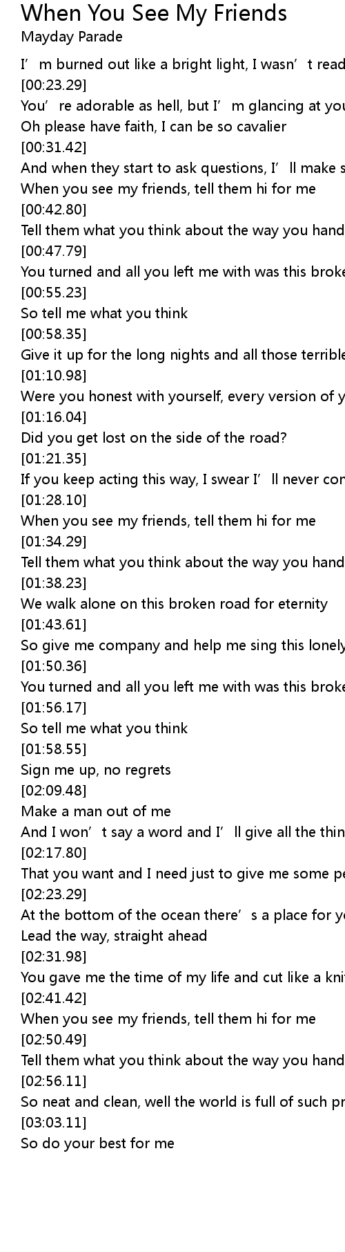 | [00:39.11] | When you see my friends, tell them hi for me |