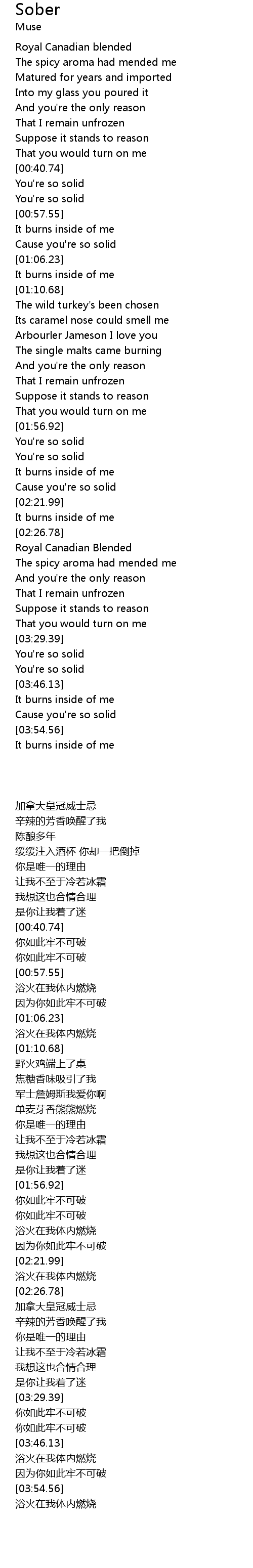 | [01:38.53] | The single malts came burning |