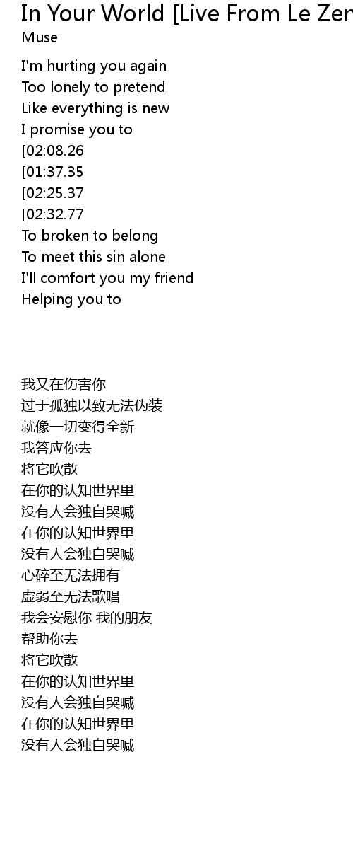 | [01:29.94][01:37.35][02:22.63][02:29.92] | In your world |