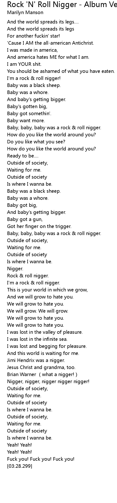 | [00:44.888] | Baby, baby, baby was a rock & roll nigger. |