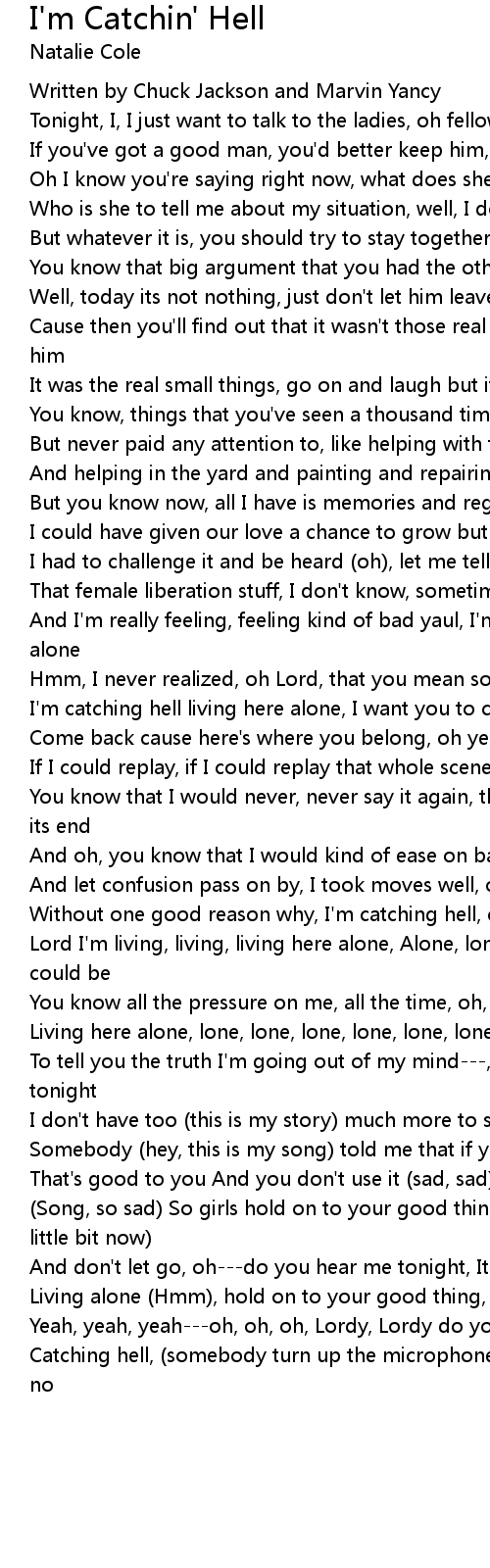 And I'm really feeling, feeling kind of bad yaul, I'm catching hell living here alone |
