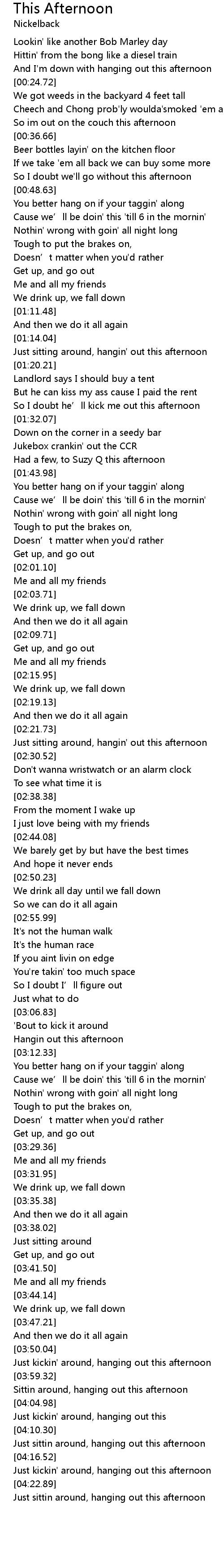 | [04:01.22] | Sittin around, hanging out this afternoon |