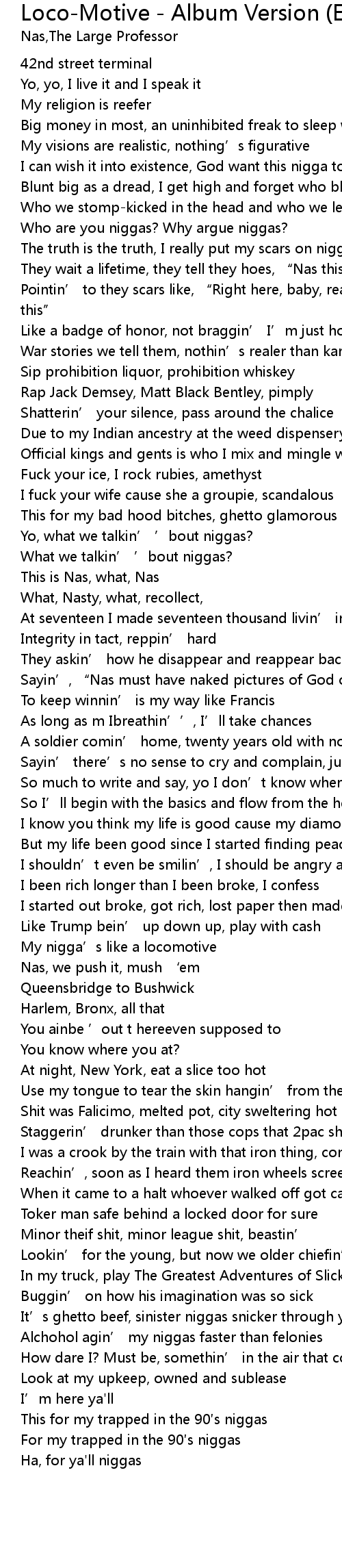 | [01:44.090] | Sayin', " Nas must have naked pictures of God or somethin'" |