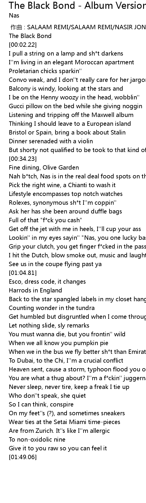 | [00:54.77] | Lookin'' in my eyes sayin'' "Nas, you one lucky bastard" |