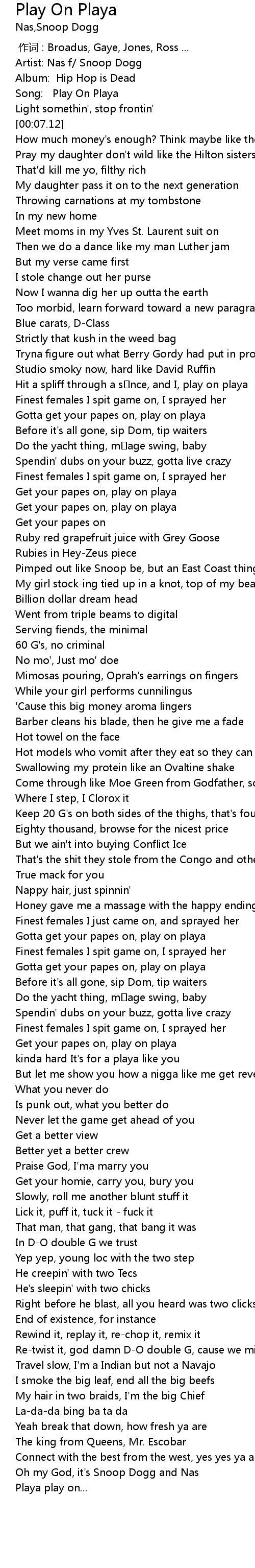 | [00:42.19] | Hit a spliff through a s�nce, and I, play on playa |
