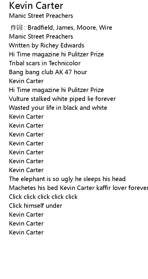 | [02:28.31] | Machetes his bed Kevin Carter kaffir lover forever |