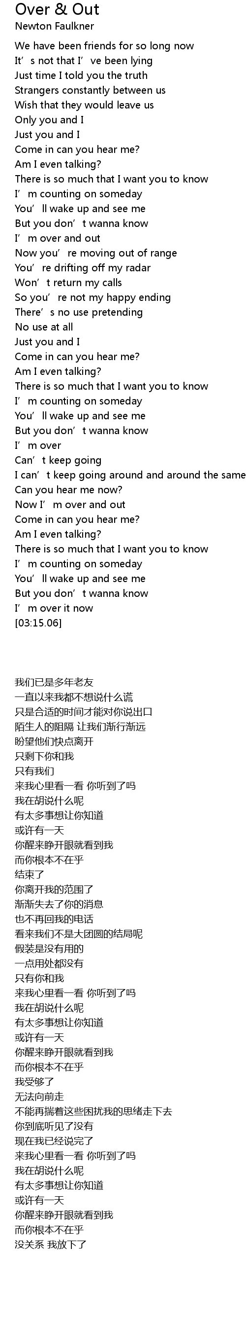 | [01:05.70] | I' m over and out |