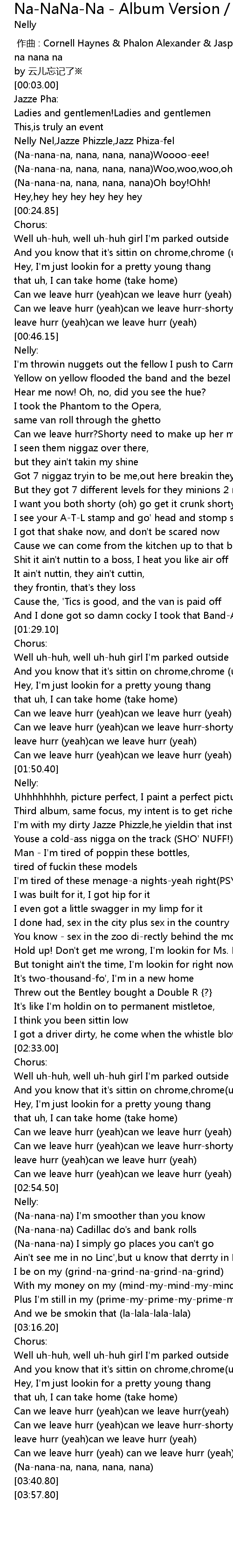 | [00:11.40] | Nelly Nel,Jazze Phizzle,Jazz Phiza-fel |