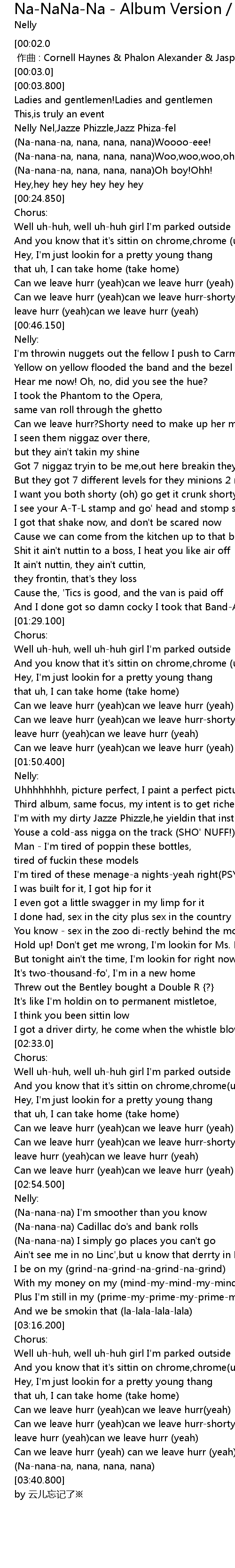 | [00:11.400] | Nelly Nel,Jazze Phizzle,Jazz Phiza-fel |