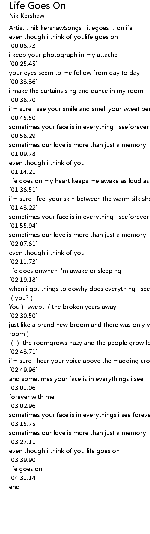 | [01:17.44] | life goes on my heart keeps me awake as loud as it beats |