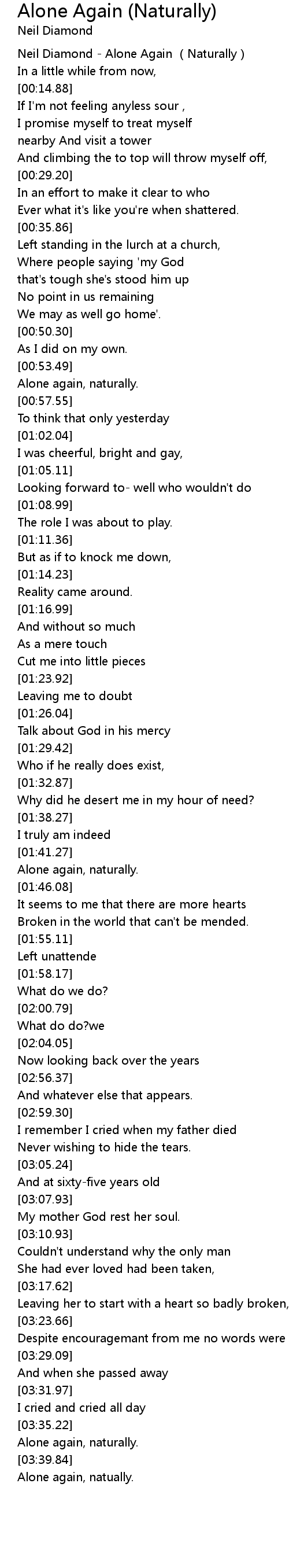 | [00:01.17] | Neil Diamond - Alone Again (Naturally) |
