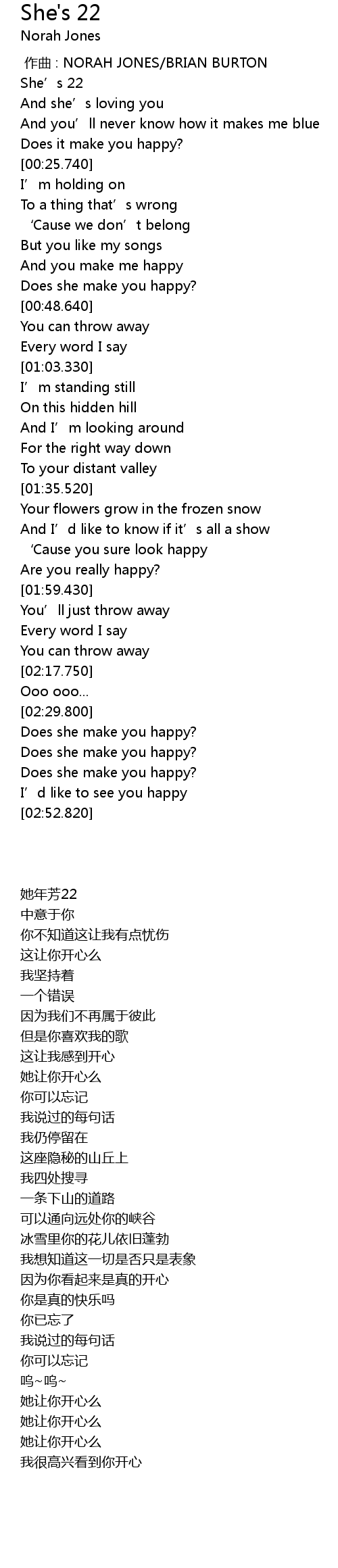 | [00:00.00] | 作曲 : NORAH JONES/BRIAN BURTON |