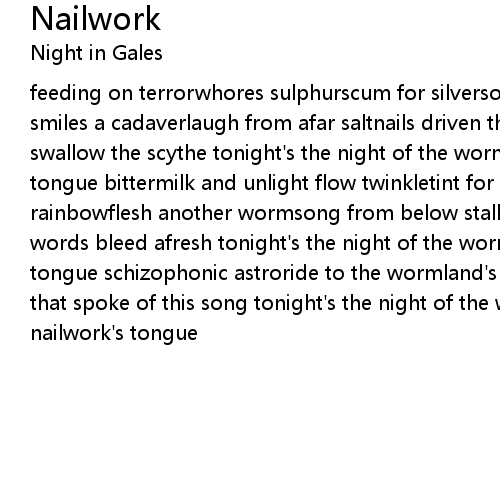 feeding on terrorwhores sulphurscum for silversouls and the coffincrow still smiles a cadaverlaugh from afar saltnails driven through hymenhearts and i swallow the scythe tonight's the night of the worm that speaks with nailwork's tongue bittermilk and unlight flow twinkletint for murmurshows and i eat some rainbowflesh another wormsong from below stalking down the gallow's pole and my words bleed afresh tonight's the night of the worm that speaks with nailwork's tongue schizophonic astroride to the wormland's vacuumnight rippin' the tongue that spoke of this song tonight's the night of the worm that speaks with nailwork's tongue |