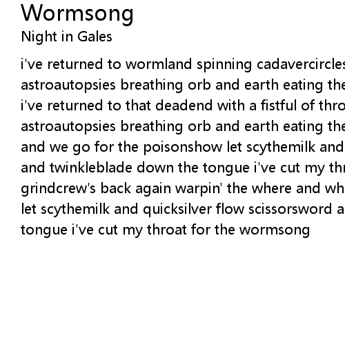 i've returned to wormland spinning cadavercircles around the night astroautopsies breathing orb and earth eating the word of a starthief's birth i've returned to that deadend with a fistful of throats from the downside astroautopsies breathing orb and earth eating the word of a starthief's birth and we go for the poisonshow let scythemilk and quicksilver flow scissorsword and twinkleblade down the tongue i've cut my throat for the wormsong the grindcrew's back again warpin' the where and when and we go for the poisonshow let scythemilk and quicksilver flow scissorsword and twinkleblade down the tongue i've cut my throat for the wormsong |