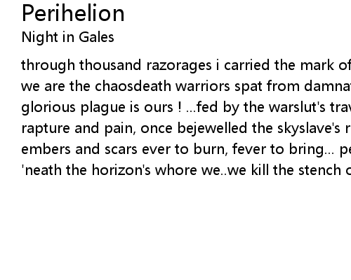 | through thousand razorages i carried the mark of yet another thousand tragedies we are the chaosdeath warriors spat from damnation's feverthorndreams the glorious plague is ours ! ...fed by the warslut's travesty the mark that, in rapture and pain, once bejewelled the skyslave's robe a lightshroud woven of embers and scars ever to burn, fever to bring... perihelion... slaughtered 'neath the horizon's whore we..we kill the stench of heaven..we kill...!! |