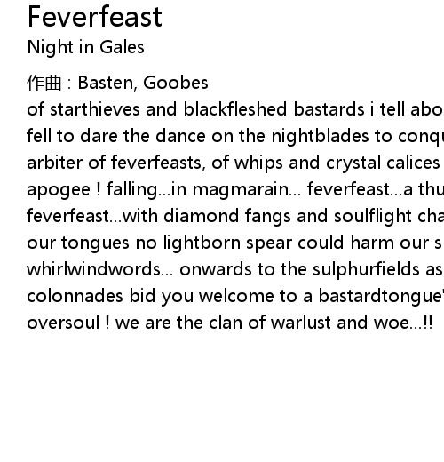 | of starthieves and blackfleshed bastards i tell about the day when warfed lilies fell to dare the dance on the nightblades to conquer and kill the skyslaves arbiter of feverfeasts, of whips and crystal calices ! command my paintale apogee ! falling... in magmarain... feverfeast... a thunderous vulvadance feverfeast... with diamond fangs and soulflight chants chaosbreed' s fire forged our tongues no lightborn spear could harm our speech a stampede of feathered whirlwindwords... onwards to the sulphurfields as stormsong and fleshy colonnades bid you welcome to a bastardtongue' s tale... to slaughter and orgies, oversoul ! we are the clan of warlust and woe...!! |